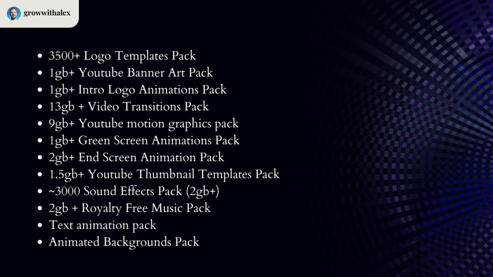 Prepare to be blown away by over 50 GB of jaw-dropping assets that will skyrocket your channel's success. Unleash Your YouTube Potential with the Ultimate YouTube Powerhouse Pack! Get ready to dominate the platform like never before with our game-changing bundle. From attention-grabbing logo templates to mesmerizing video transitions, immersive sound effects to heart-pounding royalty-free music, this pack is the secret sauce that will captivate your audience and leave your competitors in the dust!